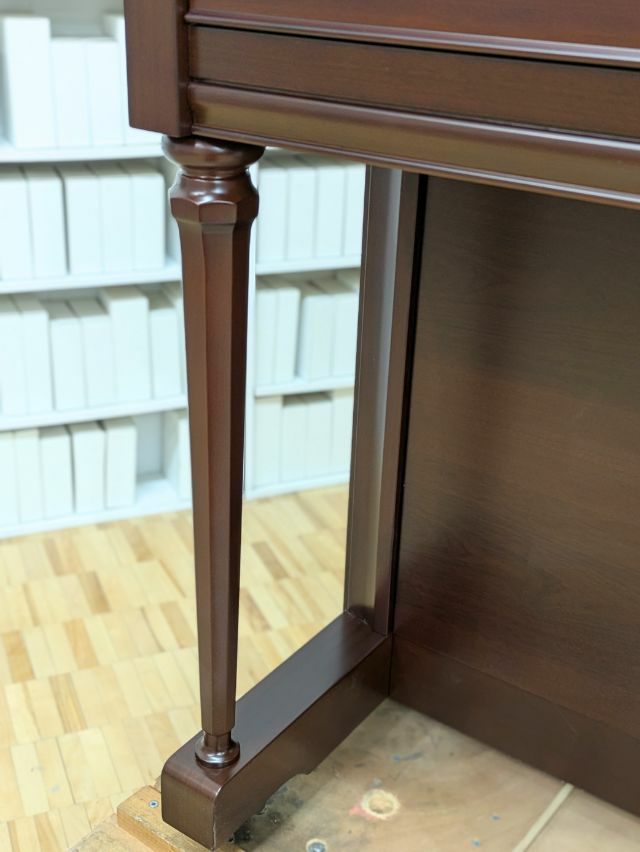 高さ110cmの小型モデルであり、木目が美しい天然木の仕上げや魅力的なフォルムの譜面台、脚柱デザインなど永く親しみやすいネオ・クラ シック様式を採用