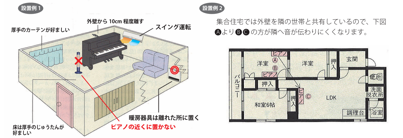 ● ピアノのコンディションの維持や不具合防止、音程や音質やタッチの維持・向上、寿命確保のために、日々の湿度・温度の管理がピアノにとって最も大切です。